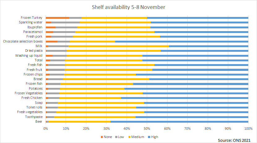 Interesting article in a recent edition of The Economist magazine on the availability of certain staples in British supermarkets based on data published by the Office for National Statistics: Frozen turkey was in the period from 5 to 8 November with 18% the item with no or low availability, followed by sparkling water (17%) and Ibuprofen (16%). On the other hand there is now also ample supply of toilet rolls, the article which was frequently out of stock last year (and this not only in the UK).