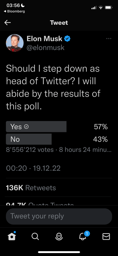 As I am in the process of finalising this post, Elon Musk has posted a poll asking his followers whether he should step down as head of Twitter. By the time I cast my vote, some 8.5 million followers had already expressed their opinion and it seems that the end result in percentage terms remained the same with in the end some 17.5 million votes cast.